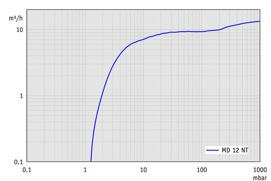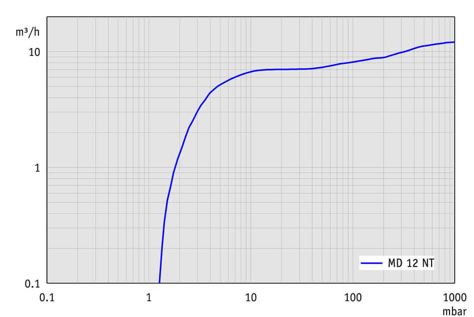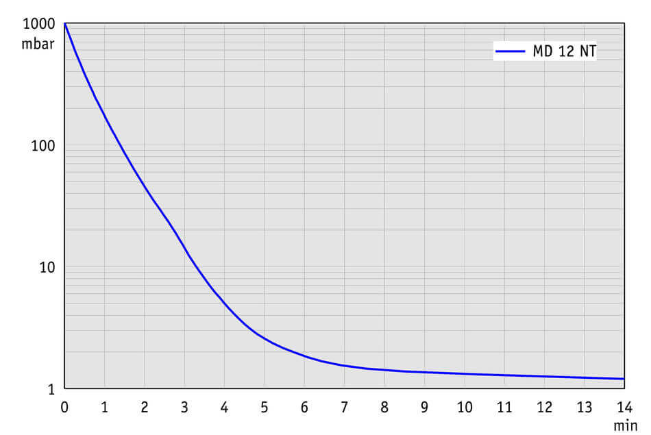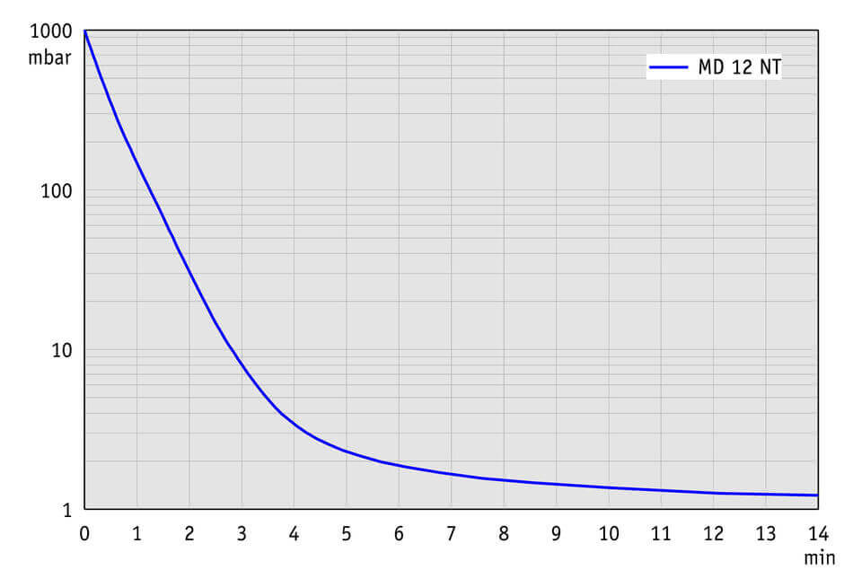 The oil-free dry compression MD 12 NT diaphragm pump is a particularly powerful pump for the evacuation and transport of non-aggressive gases. The three-stage design of the eight-cylinder pump allows an especially advantageous combination of high pumping speed with a very good final vacuum.